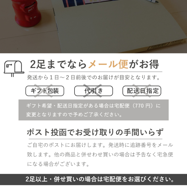 ・メール便ご利用の場合、代金引換、プレゼントラッピング、お届け日時指定のサービスはご利用いただけません。(配送方法を宅配便に変更した内容のご注文確認メールをお送りした上で、発送致します。日時指定は自動的に指定なしに変更し発送致します。)