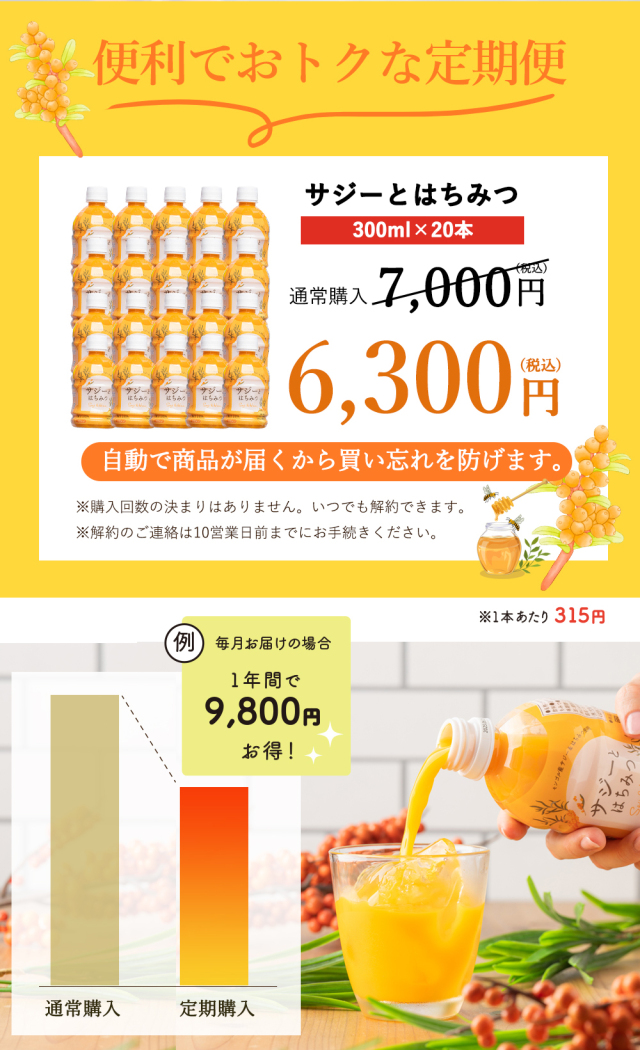 | 商品説明 | 今までありそうでなかった。サジーのペットボトル!持ち運びに便利で、いつでもどこでもそのまま飲める!はちみつ入りなのでアレンジ不要です。サジージュースには200種類以上の健康・美容成分がたっぷり入っています。 女性に不足しがちな鉄分、ビタミンA・C・Eなどの栄養素をバランス良くサポート! その中でも鉄分が豊富といわれるプルーン果実の12倍の鉄分が含まれています。 |