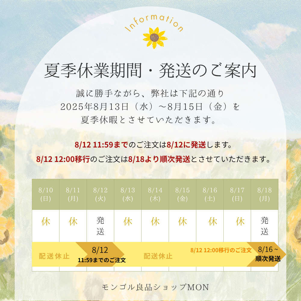 ・お休み前・お休み中に発送をご希望の場合は8/12(火)AM11:59までにご注文ください。お休み中の日時指定も可能です。